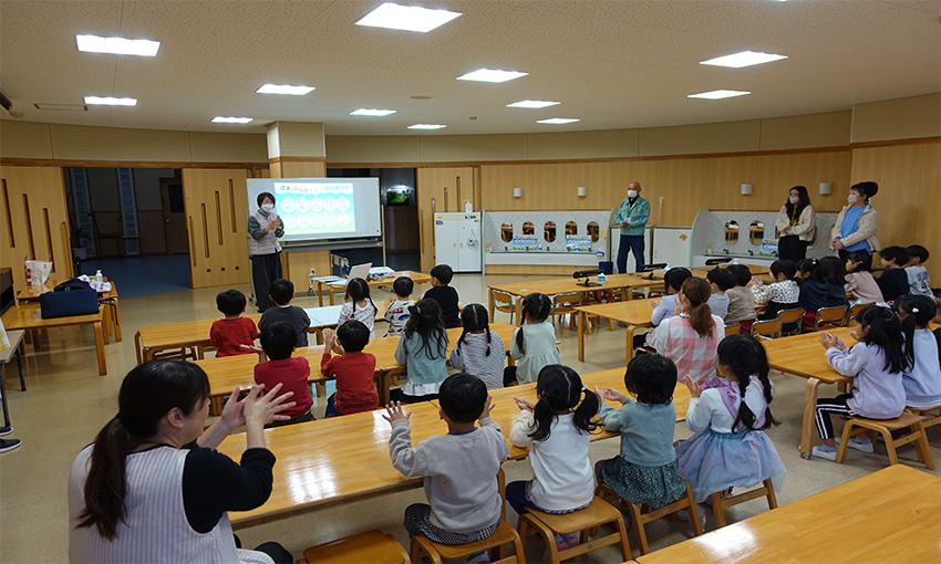 奈良県食品衛生協会の皆さまによる手洗い教室を開催しました。ききょう組とひまわり組さんが参加、手洗いの大切さを学びました。最初に、プロジェクターの紙芝居で、手洗いをしっかりしないと、身体によくないバイキンがたくさん入ってくることを教えていただきました。
