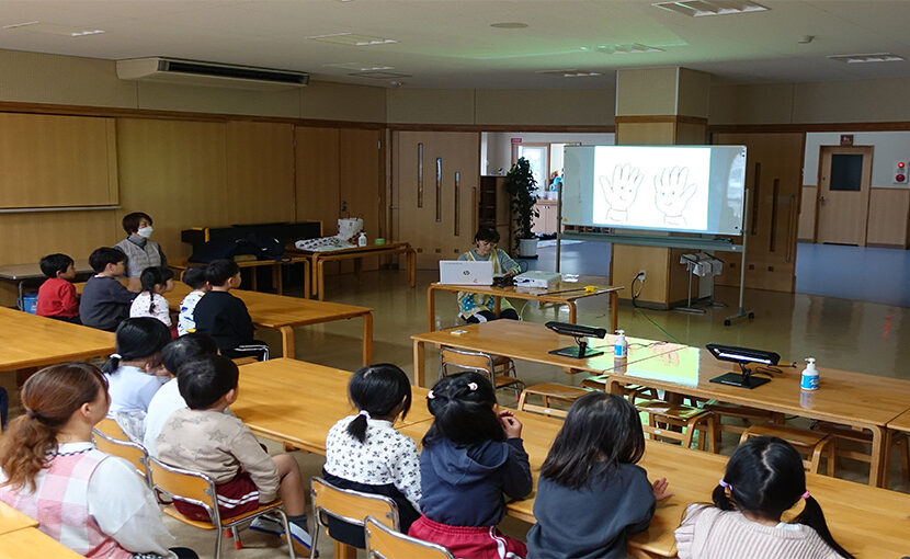奈良県食品衛生協会の皆さまによる手洗い教室を開催しました。ききょう組とひまわり組さんが参加、手洗いの大切さを学びました。最初に、プロジェクターの紙芝居で、手洗いをしっかりしないと、身体によくないバイキンがたくさん入ってくることを教えていただきました。