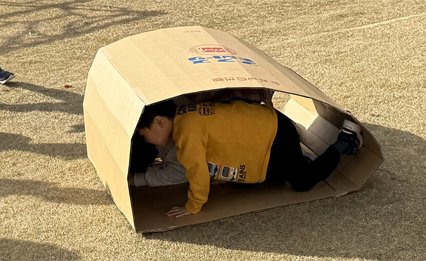 きょうは、4歳児クラス(ひまわり組)さんと3歳児クラス(さくら組)さんが段ボールを使って、園庭で遊びました。段ボールでどんな遊びをしたのでしょうね。