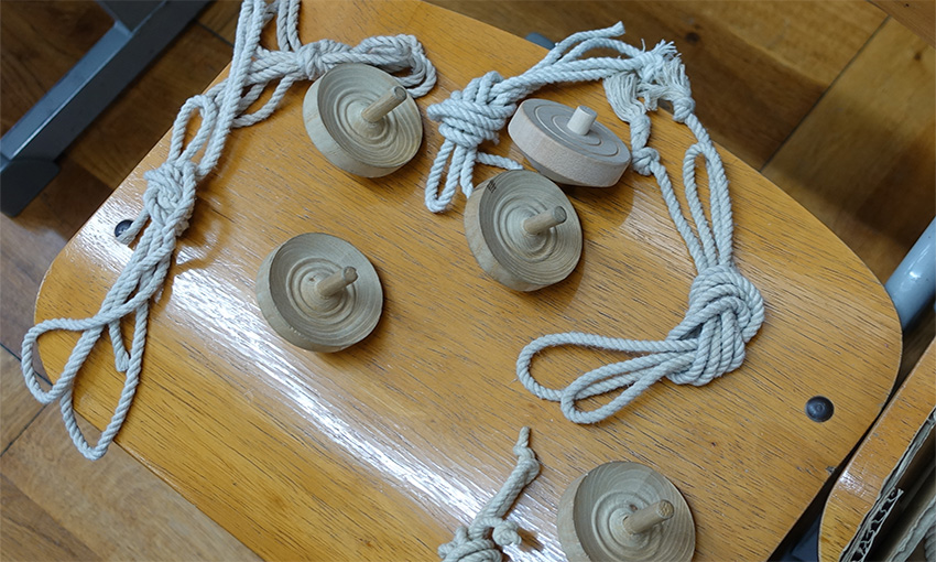 コマ回しです。ひもを巻き付けて回すコマです。ちょっと難しいけれど、一年生のみなさんにやり方を教えてもらいましょう。