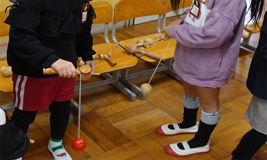 一年生のみなさんが用意をしてくれたのは、「むかしの遊び」です。おてだま、けん玉、カルタ、コマ回し・・・。