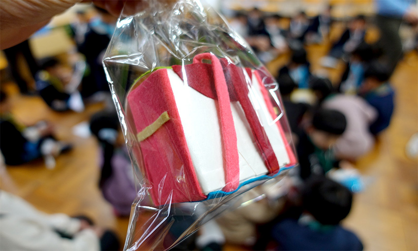 最後に、一年生のみなさんからプレゼントをいただきました。手作りのランドセルのアクセサリーです。とってもすてきなプレゼントですね。