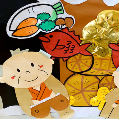 やさしいおじいさん、雪をかぶっているお地蔵さまに笠をかぶせてあげました。その夜、お地蔵さまがおじいさのお家にやってきます。日本の昔話「笠地蔵」です。寒い冬の心の温まるお話ですね。